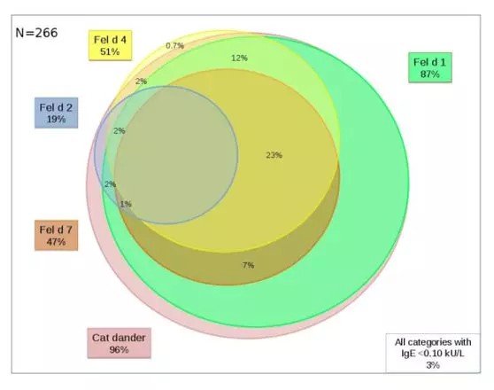 ?、?貓毛敏感的分子模式因人而異,它們與哮喘患者炎癥的關(guān)系還沒(méi)有得到廣泛的研究;② 納入哮喘病人266人(10-35歲),其IgE對(duì)貓毛、狗毛和馬毛敏感(ImmunoCAP),分析IgE對(duì)貓毛過(guò)敏原成分Fel d1(分泌球蛋白)、Fel d2(血清白蛋白)、Fel d4、Fel d7(脂蛋白)的影響;③ IgE對(duì)Fel d2的水平與FeNO (p=0.012)和總IgE (p<0.001)有相關(guān);④IgE對(duì)于Fel d 1和貓毛提取的炎癥標(biāo)記物無(wú)任何關(guān)聯(lián)(p = 0.23?0.51);⑤ 青年哮喘患者血清中IgE對(duì)脂蛋白(Fel d 4)和血清白蛋白(Fel d 2)的水平與2型生物標(biāo)志物和總IgE含量相關(guān)。