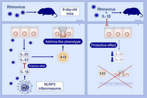 Conclusion: Macrophage IL‐1β limits type 2 inflammation and mucous metaplasia following RV infection by suppressing epithelial cell innate cytokine expression. Reduced IL‐1β production in immature animals provides a mechanism permitting asthma development after early‐life viral infection.
