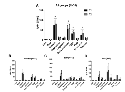 結(jié)果:54名患有慢性疼痛的受試者(12名神經(jīng)性疼痛, 14名彌漫性疼痛,11名頭痛, 17名腰痛)完成了兩次隨訪和1個(gè)月的排除飲食。在第1次隨訪中,47名(87%)受試者對(duì)至少一種食物含有中/高水平的IgG4抗體。IgG4水平最高的食物是蛋類、乳制品、谷物和干果。在第2次隨訪中,IgG4水平降低、升高或不變均有呈現(xiàn)。在所有組中,4周的排除飲食導(dǎo)致所有疼痛指標(biāo)顯著降低,生活質(zhì)量參數(shù)改善。特別是在第2次隨訪時(shí), VAS評(píng)分下降了50%以上。