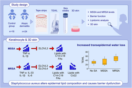 Conclusion: Aberrant skin lipid profiles and barrier dysfunction are associated with S. aureus colonization in AD patients. These effects are attributed to the inhibition of ELOVLs by S. aureus-induced IL-1β, TNF-α, IL-6, and IL-33 seen in keratinocyte models and are more prominent in MRSA than MSSA.