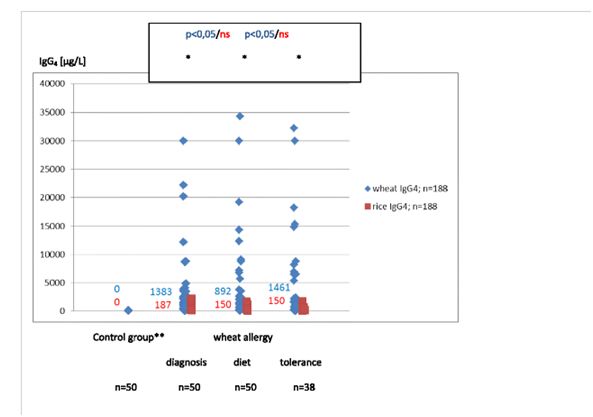 Food sIgG and sIgG4 are highly individually versatile. We put a hypothesis that one of the responsible factors is the presence of gastrointestinal inflammatory diseases. The objectives were: 1. An analysis of wheat and rice sIgG and sIgG4 in healthy children, children with IgE-mediated wheat allergy (WA), coeliac disease (CD) and Helicobacter pylori infection (HP). 2. Usability of wheat sIgG and sIgG4 in the WA diagnostics.