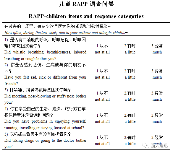 結(jié)論:兒童RAPP調(diào)查問卷是一份有效的五項問卷,用于評估6-11歲伴有哮喘和鼻炎的兒童的生活質(zhì)量。雖然中重度哮喘患者需要進一步的研究,但該工具在臨床試驗和常規(guī)醫(yī)療實踐中對改善兒童呼吸道過敏的管理是有用的。