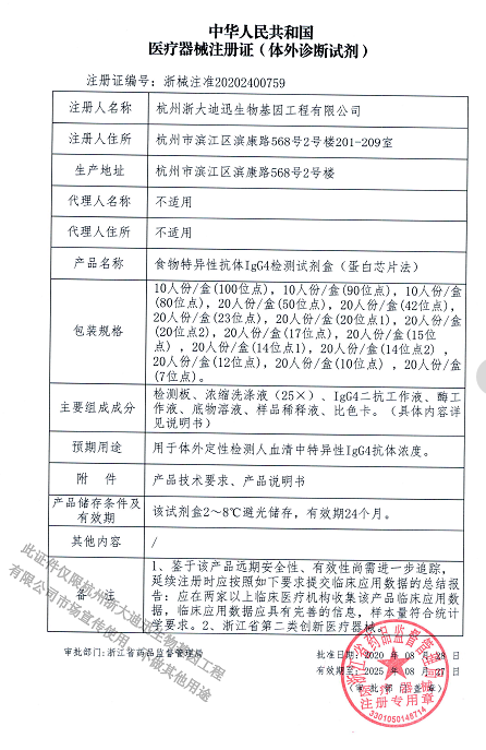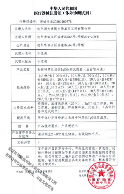 2020年9月浙大迪迅自主研發(fā)的兩個(gè)新產(chǎn)品100項(xiàng)食物特異性抗體IgG檢測(cè)試劑盒(蛋白芯片法)、食物特異性抗體IgG4檢測(cè)試劑盒(蛋白芯片法)正式取得浙江省藥品監(jiān)督管理局頒發(fā)的二類醫(yī)療器械注冊(cè)證,其中100項(xiàng)食物特異性抗體IgG4檢測(cè)試劑盒(蛋白芯片法),是國(guó)內(nèi)首家獲得醫(yī)療器械注冊(cè)證的產(chǎn)品,填補(bǔ)國(guó)內(nèi)空白,同時(shí)榮獲浙江省創(chuàng)新醫(yī)療器械。