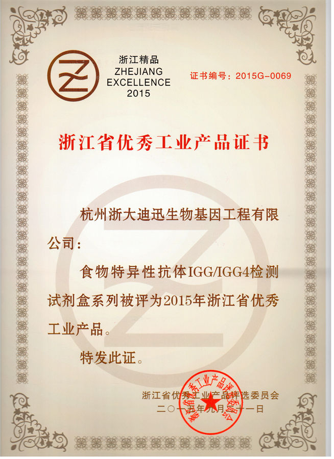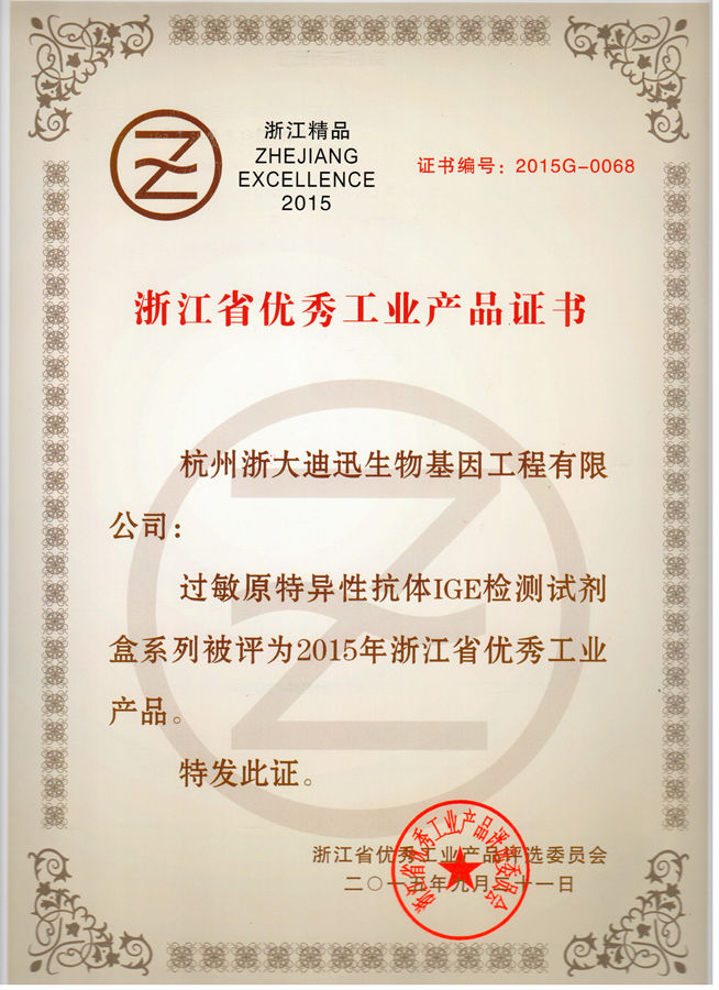 公司于2015年10月12日參加了在杭州之江飯店舉辦的“2015浙江省企業(yè)領袖峰會”,浙江省常務副省長袁家軍出席會議并作重要講話,省人大、省政協(xié)及相關部門領導蒞臨會議,會上發(fā)布并表彰了2015年浙江省優(yōu)秀工業(yè)產(chǎn)品榜單,我公司的“過敏原特異性抗體IgE檢測試劑盒系列”和“食物特異性抗體IgG/IgG4檢測試劑盒系列”均榮獲該項榮譽,表示祝賀!
